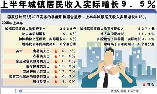 國家統(tǒng)計局進行的抽樣調查顯示,上半年城鎮(zhèn)居民家庭人均可支配收入為5374元,比去年同期增長11.6%,扣除物價上漲因素,實際增長9.5%,增幅高于去年同期0.8個百分點。