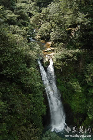 參觀完兩處紅色旅游景點(diǎn)之后,記者們順道觀光了龍?zhí)讹L(fēng)景區(qū)。龍?zhí)段挥诖钠何鞅逼吖,是近年?lái)開發(fā)的以自然與人文景觀相結(jié)合的旅游風(fēng)景區(qū)。據(jù)介紹,當(dāng)?shù)氐奈迳窈邮驱執(zhí)丁拔逄妒似佟钡脑慈。溪水沖擊小井峽谷后,陡然跌落絕壁之下,又連續(xù)飛下四級(jí)斷崖,形成梯狀的五個(gè)氣勢(shì)磅礴的瀑布和深潭,這就是碧玉、金鎖、珍珠、飛鳳、玉女等五潭五瀑。細(xì)察五潭,碧水泱泱,樹影幢幢,崖壁如刀削斧鑿,崖腳怪石,汀芷競(jìng)秀,綠蔭覆蓋四周。仰觀五瀑,潭潭無(wú)俗水,瀑瀑似神女。