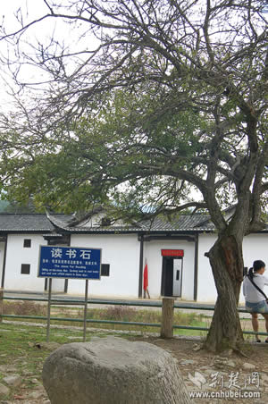 舊居坐落在大井村中央,因墻壁為白色,慣稱它為"白屋"。這棟房子共有44間,五個(gè)天井,面積近千平方米。毛澤東率領(lǐng)工農(nóng)紅軍首次到達(dá)大井時(shí)就住在這里,此后便成為毛澤東在大井的住地。1929年1月底,這棟房子被敵人燒毀,僅剩下一堵殘墻、屋后的兩棵樹和房前草坪上的一塊大石頭。1960年,當(dāng)?shù)卣丛残迯?fù),將殘墻嵌入新墻之中作為紀(jì)念。屋前的有塊大石頭因毛澤東時(shí)常坐在上面看書讀報(bào)、批閱文件,被人稱為“讀書石”。