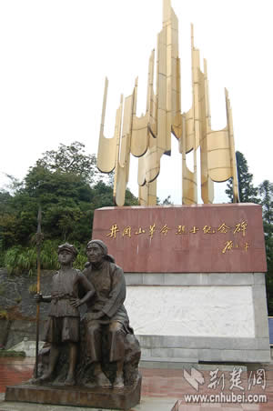 為紀(jì)念黃洋界保衛(wèi)戰(zhàn)的勝利,1965年修造了黃洋界紀(jì)念碑,碑上刻著朱德的題字“黃洋界保衛(wèi)戰(zhàn)勝利紀(jì)念碑”。在這里,我們能夠看到當(dāng)年紅軍的哨口工事、紅軍營(yíng)房。在黃洋界哨口下,導(dǎo)游指著山下一段崎嶇小路說(shuō),毛澤東、朱德和井岡山軍民挑糧走的就是這條路,“朱德扁擔(dān)被藏起來(lái)”的故事就發(fā)生在這里。