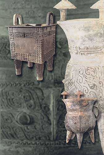 青銅乳針紋方鼎:炊器或禮器(左上,通高83厘米)