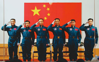昨日,6位中國航天員在酒泉衛(wèi)星發(fā)射中心航天員公寓———問天閣的一個大廳內(nèi)集體亮相。由左至右是:翟志剛、吳杰、費俊龍、聶海勝、劉伯明、景海鵬。新華社記者趙建偉攝