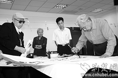 九九重陽(yáng)節(jié),武漢市老年書(shū)畫(huà)研究會(huì)的20多位老書(shū)畫(huà)家,應(yīng)邀參加“紀(jì)念抗戰(zhàn)勝利六十周年書(shū)畫(huà)筆會(huì)”。圖為原解放軍總后武漢基地指揮部中將司令員、武漢市老年書(shū)畫(huà)研究會(huì)名譽(yù)會(huì)長(zhǎng)張書(shū)坤奮筆作書(shū)“勿忘國(guó)恥,不辱使命”八個(gè)遒勁有力的大字。