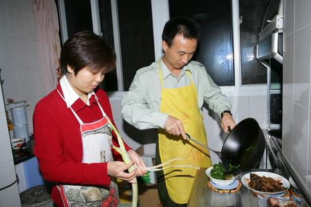 航天員費俊龍在家中幫愛人王潔炒菜,樂在其中
