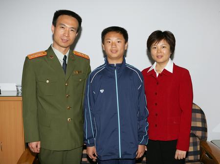 航天員費俊龍和愛人王潔、兒子費迪在家中合影