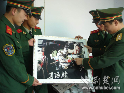 昨日,武警襄樊市支隊(duì)官兵來到航天英雄聶海勝家中,慰問聶媽媽,踏訪英雄的成長足跡。從墻上取下聶家珍藏的聶海勝的照片,武警官兵無不為這個(gè)戰(zhàn)友自豪。