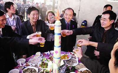 襄樊市委領(lǐng)導(dǎo)靳永龍、馬黎,棗陽市委書記常全華和聶新勝等人,來到精心制作的生日蛋糕前,切生日蛋糕。頓時,歡樂的禮花四處綻放,鞭炮齊鳴。來自全國各地的百余名記者紛紛舉起手中的相機,閃光燈閃個不停,爭相記錄下這難忘的一刻。