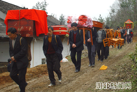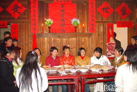 今年1月,該縣文化部門在采花鄉(xiāng)找到完整的“唐祭儀式”藝人班子。十幾名藝人雖然在解放后都沒有再進(jìn)行過“告祖”儀式,但整個程序記得十分清楚。經(jīng)協(xié)商策劃,決定利用男女雙方實景把“告祖”及土家婚俗完整真實拍攝下來。3月28日,市縣兩級文化工作專班和十六名民間藝人開赴傅家堰火山村,日夜奮戰(zhàn)4天,終于把“告祖”的整個程序以寫實手法拍攝下來。同時,還拍攝到了土家婚俗中背新娘、吃雞蛋茶、抬花轎、陪十弟兄、陪十姊妹的珍貴鏡頭,把土家婚俗完整記錄了下來,為項目的申報工作進(jìn)一步夯實了基礎(chǔ)。