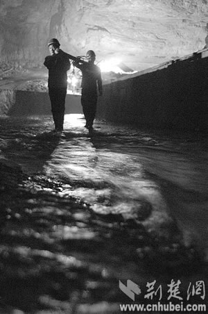 寂寞的蝙蝠第一次接待了人間來(lái)客,沉睡萬(wàn)年的巖溶洞穴第一次迎來(lái)了觀者。但黑暗陌生的世界還是讓堂堂男兒們感覺(jué)了一絲陰森恐怖。他們?cè)?tīng)當(dāng)?shù)匕傩諅髡f(shuō),洞里有巨蟒,所以至今沒(méi)人敢進(jìn)洞!白ゾo時(shí)間測(cè)量!”來(lái)不及恐懼,他們?yōu)樽约汗膭,因(yàn)檫@里隨時(shí)可能發(fā)生漲水、墜落等危險(xiǎn)?上,第一次經(jīng)驗(yàn)不足,手電筒的電池很快用完了,一行人只得互相攙扶著,摸索出溶洞!昂髞(lái),我們又進(jìn)去了7次,終于測(cè)出了暗河的具體位置和流向!狈轿奈湔f(shuō)。