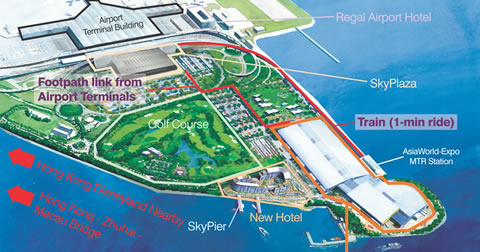 亞洲國際博覽館選址大嶼山香港國際機場附近,可通過完善的海陸空交通網(wǎng)絡(luò),連接全球各大主要城市。渡輪服務(wù)和完備的陸路交通配套設(shè)施,將博覽館連接至珠江三角洲城市及澳門等地。亞洲國際博覽館是香港展覽業(yè)持續(xù)發(fā)展的重要建設(shè)項目,將與現(xiàn)在位于灣仔的香港國際會展中心形成互補。