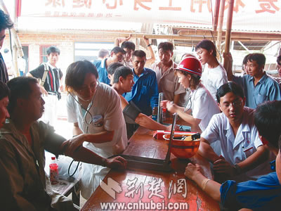 15日,參加武鋼工程建設(shè)的百余位農(nóng)民工兄弟,樂呵呵地接受了中國(guó)一冶電裝公司武鋼項(xiàng)目部為他們免費(fèi)進(jìn)行的體檢。浠水工程隊(duì)民工朱宗杰說(shuō):“這兩年來(lái),社會(huì)各界對(duì)農(nóng)民工的關(guān)心很實(shí)在!