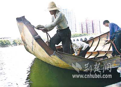 “船太大了,沒辦法運出城,只好進行分解后運走。”負(fù)責(zé)現(xiàn)場施工的馬先生解釋,2002年初,他所在的公司承攬東湖清淤工程,共運來8條清淤船,其中一條船放置在水果湖。當(dāng)時,經(jīng)有關(guān)部門批準(zhǔn),這些船由大型車輛運來并吊入湖中。目前清淤工程結(jié)束,湖中的船不好運走,只好割成一塊塊鋼板,當(dāng)成廢鋼賣掉。