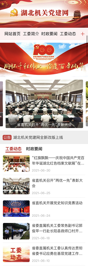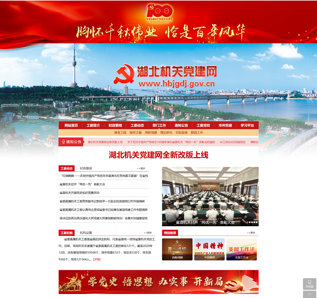 荊楚網(wǎng)(湖北日?qǐng)?bào)網(wǎng))訊(記者謝頤 通訊員鄭羽嬋)在中國(guó)共產(chǎn)黨成立100周年之際,湖北機(jī)關(guān)黨建門(mén)戶網(wǎng)站湖北機(jī)關(guān)黨建網(wǎng)(http://www.hbjgdj.gov.cn/)電腦端、移動(dòng)端全新改版上線。這是省委直屬機(jī)關(guān)工委積極探索智慧黨建的有效途徑,是加強(qiáng)省直機(jī)關(guān)黨建宣傳工作的重要舉措,是為黨慶生、為黨祝福獻(xiàn)上的特殊禮物。