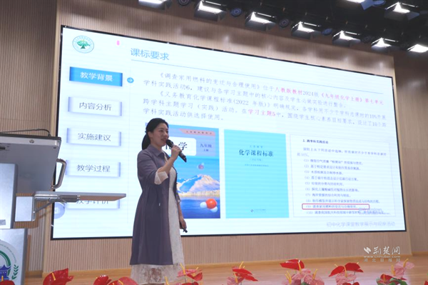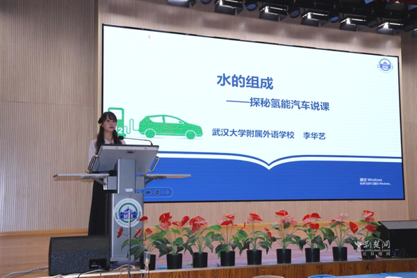 武漢大學(xué)附屬外語(yǔ)學(xué)校李華藝?yán)蠋焾?zhí)教《水的組成——探秘氫能汽車》展示課。課程以新能源汽車為線索,設(shè)計(jì)四大項(xiàng)目,學(xué)生通過海報(bào)、角色扮演等形式展示探究成果。李老師引導(dǎo)學(xué)生從宏觀、微觀、符號(hào)三重視角認(rèn)識(shí)水的組成,最終用電解產(chǎn)生的氫能讓小車現(xiàn)場(chǎng)行駛,實(shí)現(xiàn)化學(xué)與科技的有機(jī)融合。說課環(huán)節(jié)中,她介紹項(xiàng)目圍繞“氫能汽車如何工作”展開,借助AI模擬生產(chǎn)過程,讓學(xué)生感受化學(xué)的實(shí)踐價(jià)值。