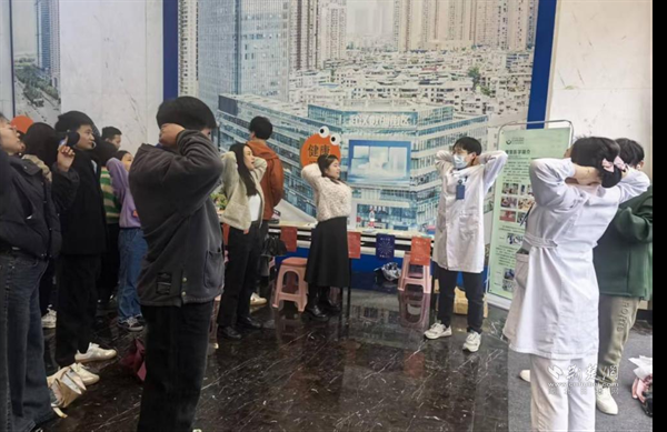 “健康驛站”區(qū)域,武昌醫(yī)院醫(yī)務人員為職工提供血糖血壓測量、頸椎腰椎檢查等服務,現(xiàn)場教學健康操,指導大家利用工作間隙科學鍛煉、緩解疲勞。