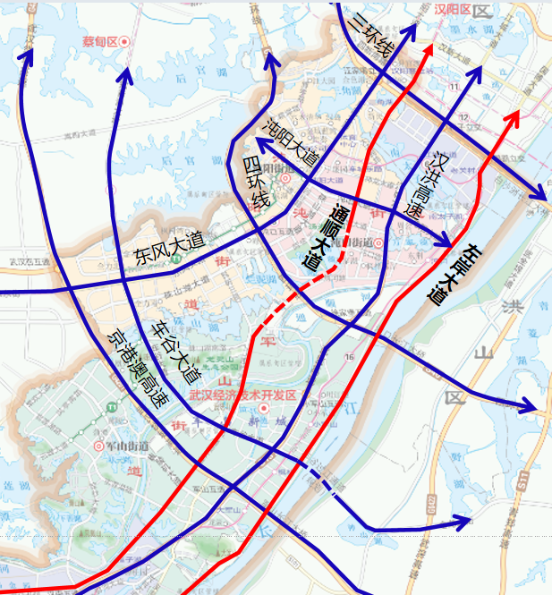 通順大道是武漢經開區(qū)繼東風大道、江城大道、左岸大道(沿江大道)之后連接主城區(qū)的第四條交通動脈,也是大漢陽片區(qū)交通一體化的重要組成部分。