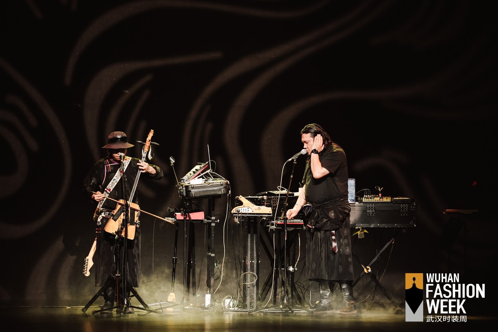 陳宇攜手Taiga樂隊,把錫林郭勒草原的晨霧、馬頭琴與電子節(jié)拍轉(zhuǎn)化成可行走的時裝音景??沙掷m(xù)植物素皮、流蘇與繩結(jié)形成呼應(yīng),讓游牧精神在當代廓形中保持自由。