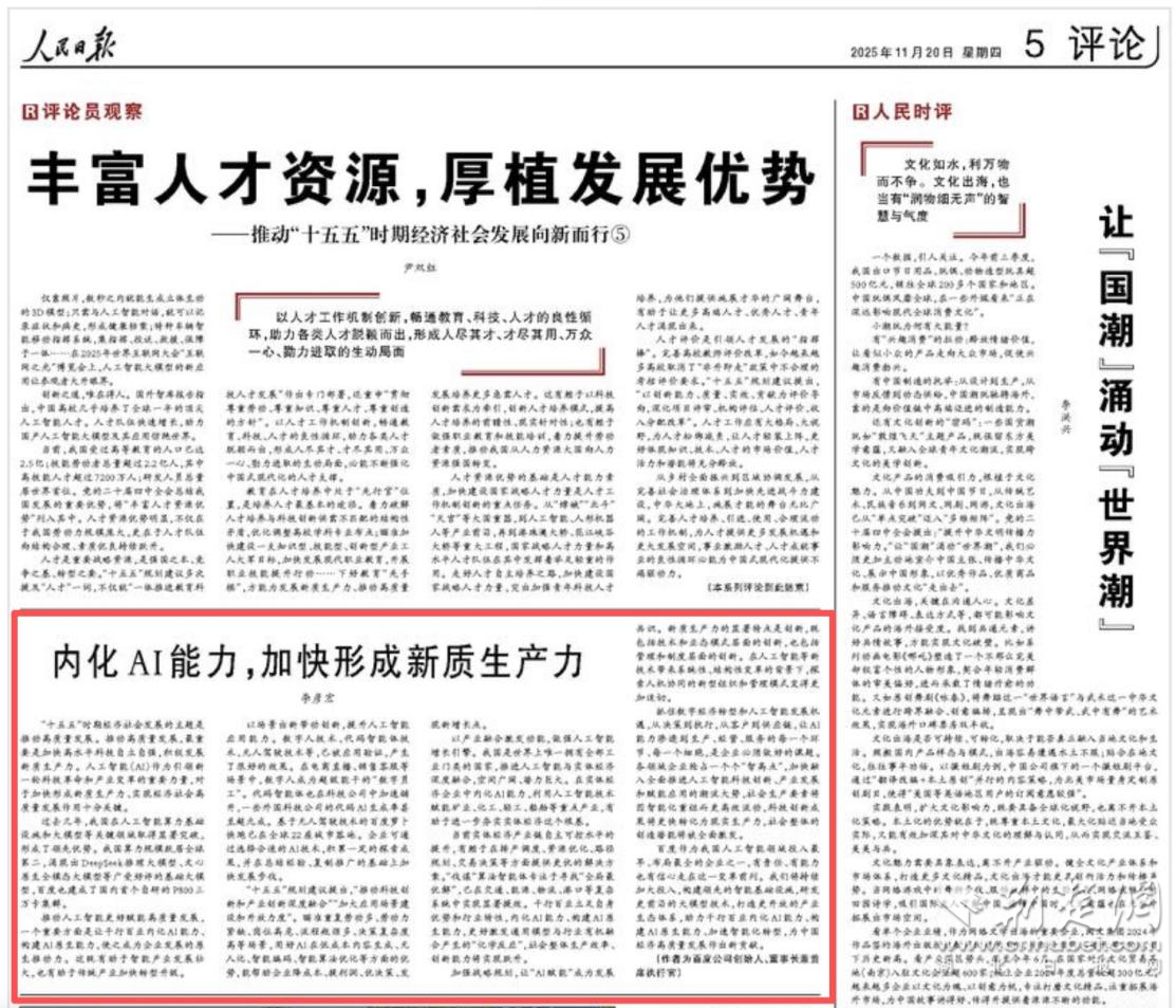 荊楚網(wǎng)(湖北日報網(wǎng))訊(通訊員 杜軒)11月20日,百度創(chuàng)始人、董事長兼首席執(zhí)行官李彥宏在《人民日報》發(fā)表題為《內化AI能力,加快形成新質生產(chǎn)力》的署名文章。他指出,推動人工智能更好賦能高質量發(fā)展,一個重要方面是讓千行百業(yè)內化AI能力,構建AI原生能力,使之成為企業(yè)發(fā)展的原生推動力。