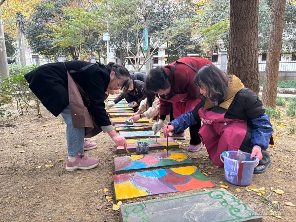 30余名黨員與社區(qū)居民攜手執(zhí)筆,在社區(qū)能人的指導(dǎo)下,依據(jù)設(shè)計(jì)圖稿細(xì)心勾勒線條,精心調(diào)配赭石、石青、石綠等傳統(tǒng)礦物色彩,悉心填充花瓣、枝葉。草坪里原本素樸的地磚漸漸綻放出繽紛圖景:象征革命精神的紅色印記、勾勒武昌古城風(fēng)貌的文化符號(hào),以及依循“十二花令”鋪陳的水仙、桃花、菊花等時(shí)令花卉與梅蘭竹菊的清雅風(fēng)骨藝術(shù)化呈現(xiàn)。