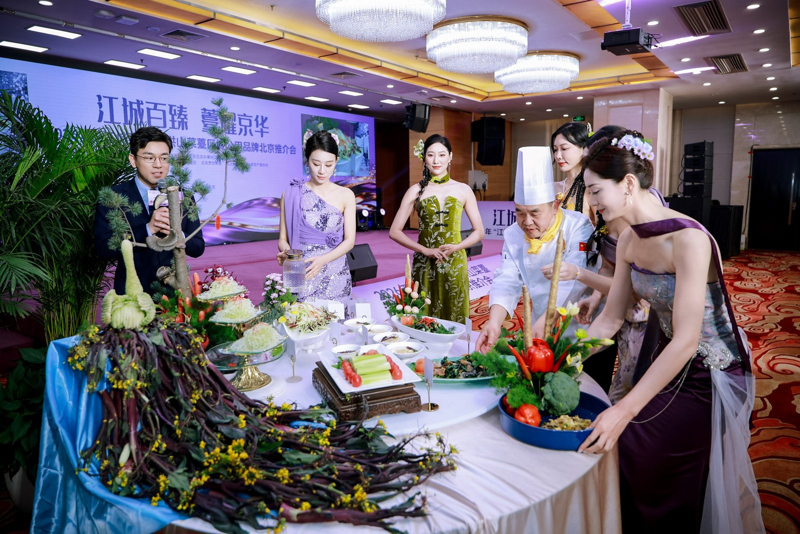 活動現(xiàn)場,《千年一“薹”,京誠所愛》情景劇生動詮釋洪山菜薹的傳承與創(chuàng)新,產品走秀與藝術插花表演凸顯其美學價值,楚菜名廚現(xiàn)場演繹“一薹多吃”宴席,展現(xiàn)菜薹融入京鄂風味的烹飪創(chuàng)意。京城網紅大廚隋坡登臺品鑒,為洪山菜薹實力“打call”。現(xiàn)場同步設置國風市集,展出鮮薹、鎖鮮產品及禮盒,供嘉賓品鑒體驗。