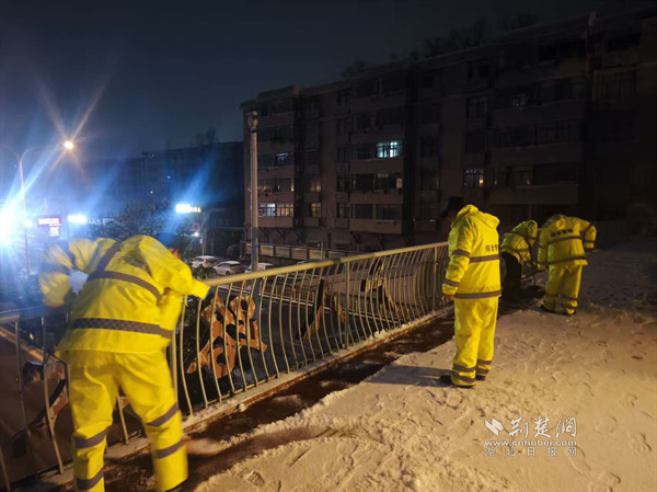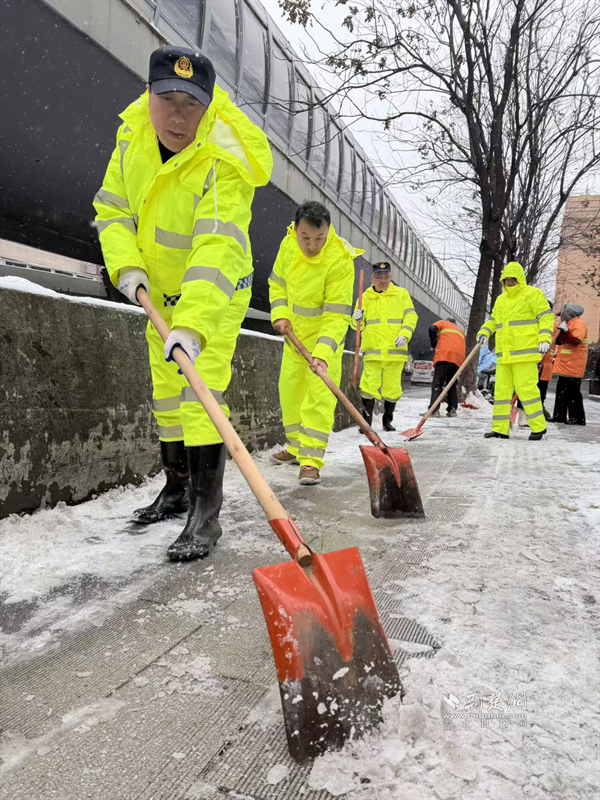 1月19日深夜至20日凌晨,隨著雪勢加大,街道應急搶險隊伍迅速化身“風雪夜行人”,頂著嚴寒奔赴一線。他們采取機械作業(yè)與人工作業(yè)相結(jié)合的方式,對轄區(qū)主次干道、橋梁、陡坡、十字路口等重點路段和易結(jié)冰區(qū)域,進行循環(huán)撒布融雪鹽和清掃作業(yè),最大限度預防道路結(jié)冰。寒夜中,隊員們衣衫被雪花浸濕,臉頰被寒風凍紅,但無人退縮,持續(xù)堅守。天色微明,雪勢稍歇,隊伍立即轉(zhuǎn)戰(zhàn),對背街小巷、人行道、天橋等區(qū)域的殘留積雪進行清理,并在坡道、臺階等易滑處鋪設防滑草墊、設置警示標識,全力保障早高峰出行安全順暢。