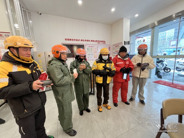 武昌區(qū)總工會(huì)維權(quán)服務(wù)部負(fù)責(zé)人夏巨波與街道工會(huì)工作人員一邊分發(fā)慰問物資,一邊與大家親切交談:“雪天路滑,騎車千萬要慢行,安全第一?!薄绑A站里備了熱水和微波爐,累了隨時(shí)進(jìn)來歇腳,別凍著自己?!?/p>
