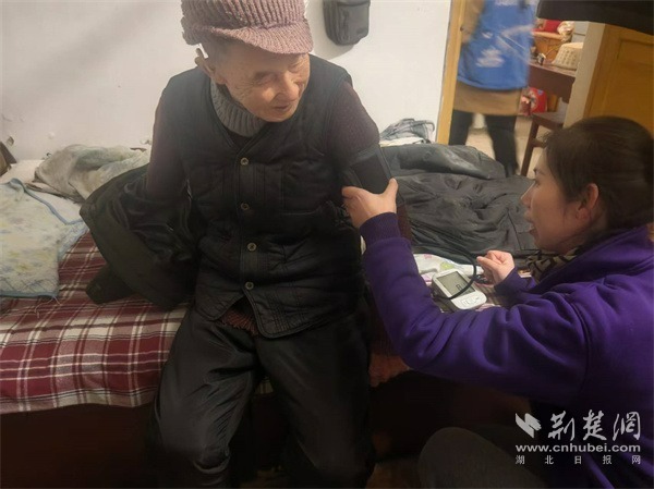 社區(qū)養(yǎng)老顧問為老人監(jiān)測(cè)血壓。 通訊員供圖