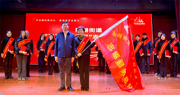活動的另一重頭戲,是“了不起的居民”志愿服務(wù)總隊的成立儀式。在區(qū)委社會工作部部長謝琬宣讀成立文件后,區(qū)委副書記、統(tǒng)戰(zhàn)部部長劉海停上臺為總隊隊長張淑靜授旗,標(biāo)志著南湖街道近300支活躍的志愿服務(wù)隊伍,有了統(tǒng)一的旗幟與核心。