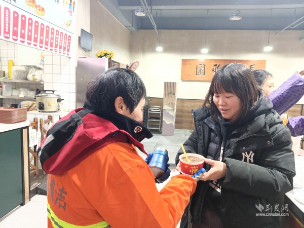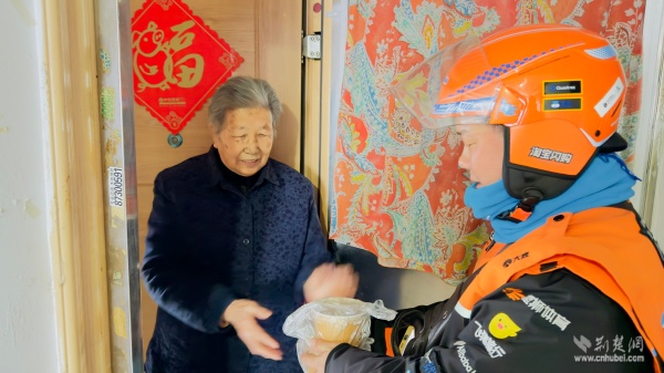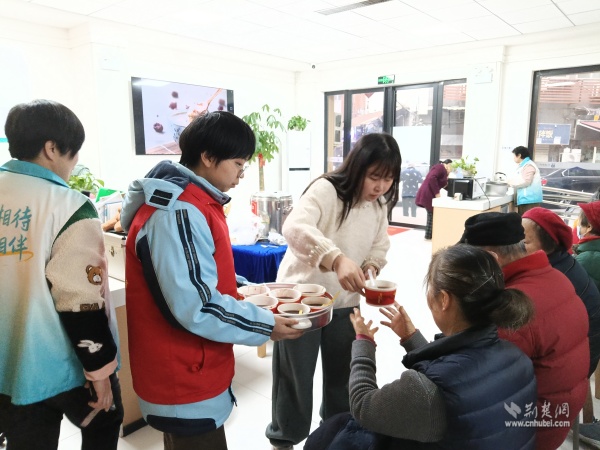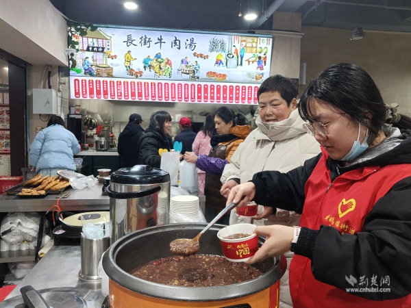 溫暖派送覆蓋多元群體。在戶外勞動者驛站,環(huán)衛(wèi)工人、快遞外賣騎手從志愿者手中接過熱粥;社區(qū)還鏈接武漢市第三醫(yī)院資源,為戶外工作者提供健康咨詢。幾位外賣騎手主動化身“公益騎手”,與黨員志愿者一同將暖心粥品送至“鶴耋安”高齡獨居老人家中。黨員志愿者還走訪了周邊商戶、殘疾人家庭及退役軍人家屬,并在社區(qū)設點邀請居民共享溫情。一碗粥,沿著黨員和志愿者的溫暖足跡,流入社區(qū)每個角落。