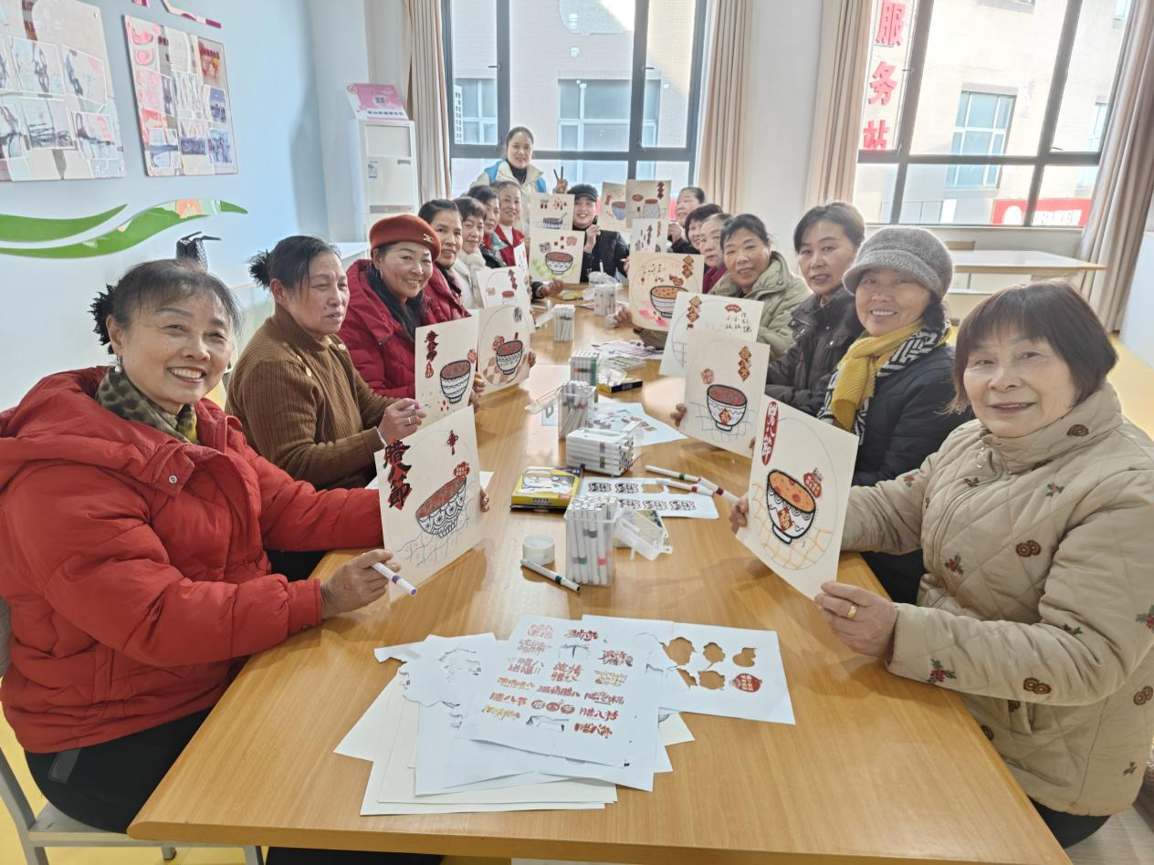 社區(qū)老年人活動(dòng)中心內(nèi),老人們圍坐在一起體驗(yàn)“溫情臘八”手工繪畫,在創(chuàng)作中增進(jìn)鄰里情誼?!昂枚嗄隂]畫過畫了,今天好像回到了年輕時(shí)候!”74歲的李庭香老人舉著自己剛完成的《臘八團(tuán)圓圖》笑著說道。