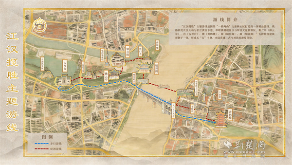 “江漢攬勝”主題游線以百年輪渡為紐帶,串聯(lián)起5A級(jí)黃鶴樓景區(qū)與4A級(jí)知音文化旅游區(qū),集亭、臺(tái)、樓、閣、殿五種傳統(tǒng)建筑形制于一體,生動(dòng)展現(xiàn)武漢“半城山水半城詩”的城市意象。游線自黃鶴樓啟程,途經(jīng)斗級(jí)營、戶部巷,乘輪渡橫渡長(zhǎng)江,觀賞晴川燈會(huì),最終探訪知音殿、游覽古琴臺(tái),集萃武漢長(zhǎng)江兩岸自然風(fēng)光、文化地標(biāo)與城市煙火氣,是自然與人文、傳統(tǒng)與現(xiàn)代交融的精品線路。