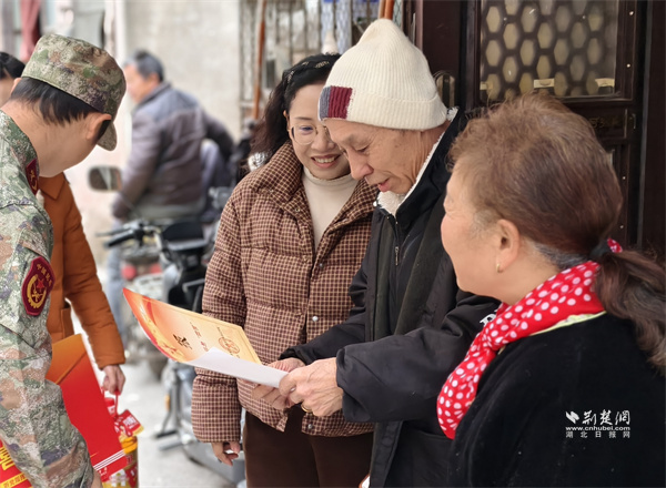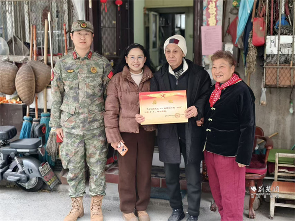 荊楚網(wǎng)(湖北日報網(wǎng))訊(通訊員 蘇楚雄 鐘霓 游薇 侯本瑞)1月29日,武昌區(qū)楊園街道電力新村社區(qū)鑼鼓聲響、熱鬧非凡。街道人武部、退役軍人服務(wù)站和社區(qū)工作人員組成“報喜小隊”為現(xiàn)役軍人家屬送去子女在部隊榮獲的“四有”優(yōu)秀學員榮譽證書,并送上慰問物資,傳遞對軍屬的崇高敬意和誠摯關(guān)懷。