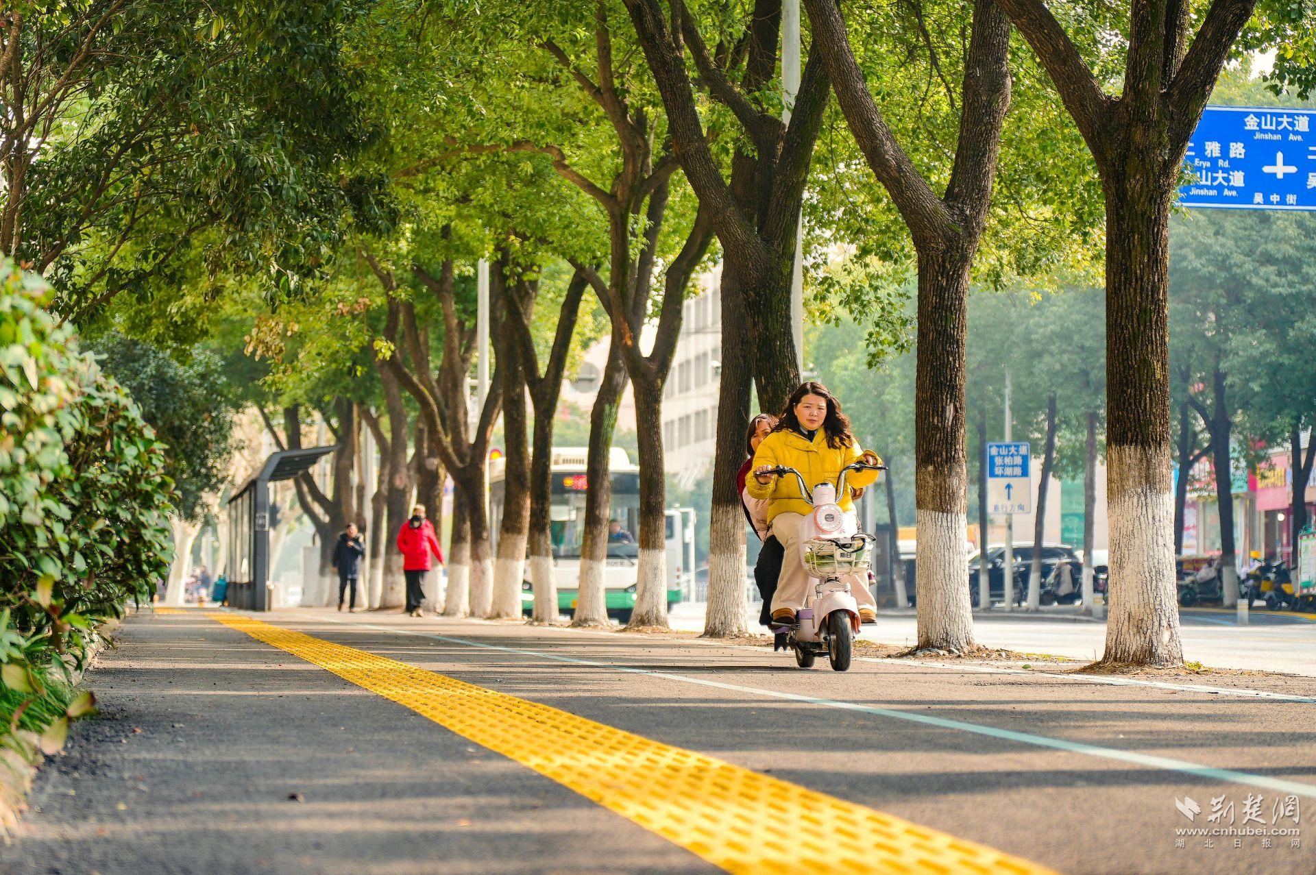 另一個(gè)明顯變化是,人行道旁多出了一條清晰的非機(jī)動(dòng)車道。過(guò)去,吳中街沒(méi)有專門的非機(jī)動(dòng)車道,人車混行存在隱患?,F(xiàn)在,“人非共面”的模式讓騎行與步行各自有序,盲道也同步更新,安全系數(shù)大幅提升。