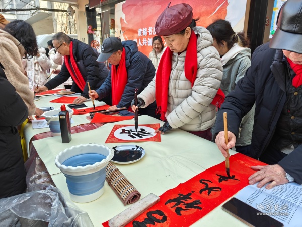 靜態(tài)的閱讀空間里藏著動態(tài)的文化活力。每周固定開展的書法研習、讀書分享活動中,總能看到老少讀者沉浸其中的身影。青少年圍坐桌前臨摹字帖,老年讀者在窗邊沉浸品讀,年輕父母攜娃共讀繪本,不同年齡層在墨香與書聲中和諧交流。春節(jié)期間,書房特邀首義書畫協(xié)會的老師現(xiàn)場揮毫,紅紙鋪展間,一副副滿載祝福的春聯(lián)、一張張寓意吉祥的福字被送到居民手中,讓文化關懷伴隨墨香走進千家萬戶?!笆謱懙拇郝?lián)更有溫度,墨香里都是社區(qū)的關懷。”居民李阿姨接過春聯(lián)時笑著說,她的話也道出了居民共同的心聲。