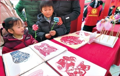 免費領(lǐng)取新春剪紙后,小朋友迫不及待展示。
