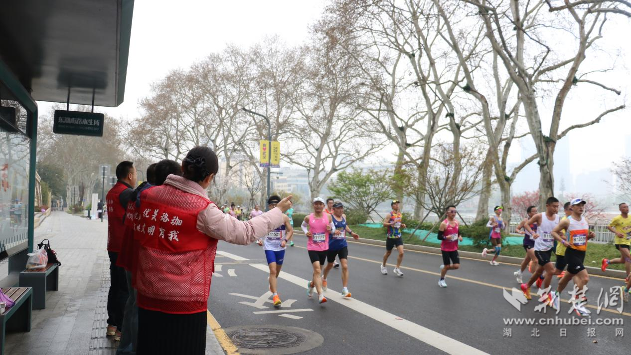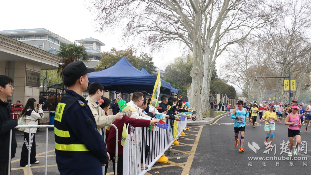 “加油!加油!”“你們是最棒的!”……當天,位于賽道沿線的中國科學院水生生物研究所自發(fā)組織了“助威團”。科研人員們暫時放下手中的顯微鏡,揮舞著彩旗和手舉牌,用最熱烈的吶喊為中外跑者加油鼓勁,將嚴謹科研之外的澎湃熱情灑滿賽道。除了吶喊助威,轄區(qū)共建單位還貼心地設置了“愛心補給站”,為跑者提供飲用水、水果等補給物資,不僅為選手們“充電”,更讓這場國際賽事充滿了“珞珈溫度”。