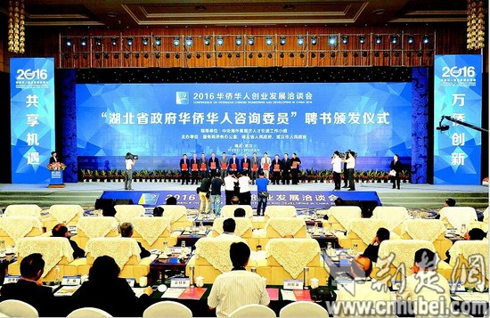 圖為:昨日上午,2016年“華創(chuàng)會”在武漢東湖國際會議中心開幕。圖為“湖北省政府華僑華人咨詢委員”聘書頒發(fā)儀式現場。...">